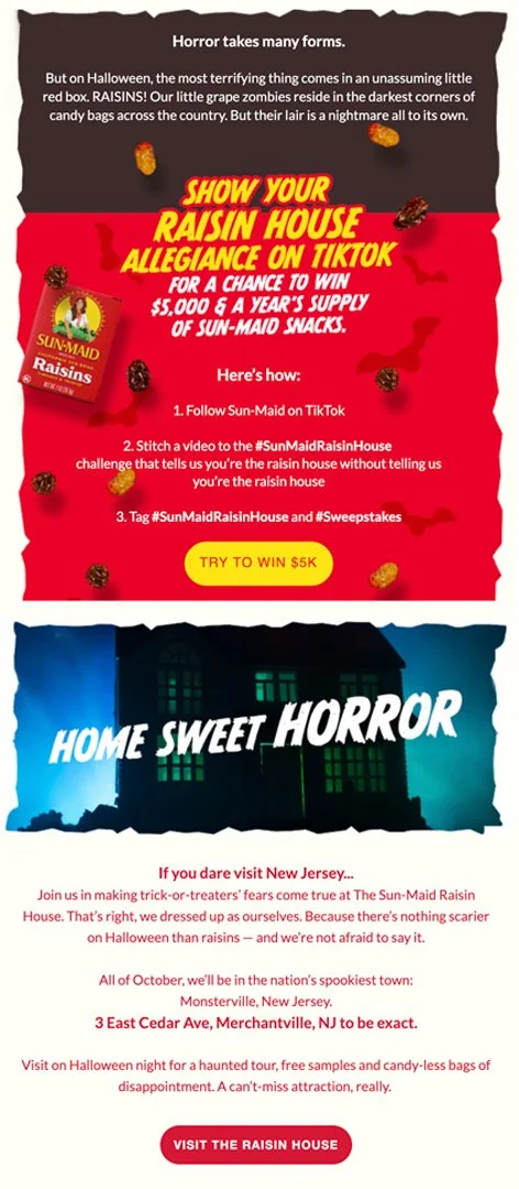 How do Sun-Maid Raisins fit into Halloween? They don’t. So instead of fighting dried grape’s infamous reputation, we leaned in — hard. The result was an amazing hair-raising raisin house, a cheeky TikTok challenge, a puny cleanup kit and a flood of PR.